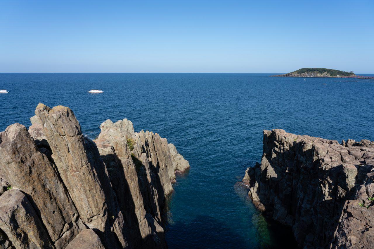 大迫力の断崖絶壁: 輝石安山岩の柱状節理が約1km続き、国の天然記念物にも指定される壮大な景観。