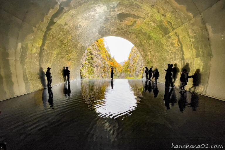 かつての遊歩道が落石事故により通行止めになったため、現在は安全に渓谷美を楽しめる全長750mのトンネルが整備されています。トンネル内には現代アート作品が展示されており、幻想的な空間を歩きながら峡谷へと向かいます。